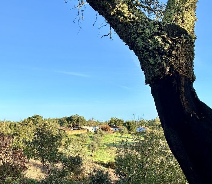 Nous avons rencontré Vincent, le porteur de projet de Neos, qui nous a fait visiter les lieux et a présenté son approche de développement de conscience par le collectif. Une très grande étendue de terre a été achetée, qui s’étend jusqu’à l’horizon, encore essentiellement occupée aujourd’hui par la culture de chênes-lièges, et qui abritera un village en projet. Là où nous sommes, un ancien corps de ferme en pleine restauration proposera l’aspect « Transformation » du projet, à travers ateliers et activités de développement personnel.